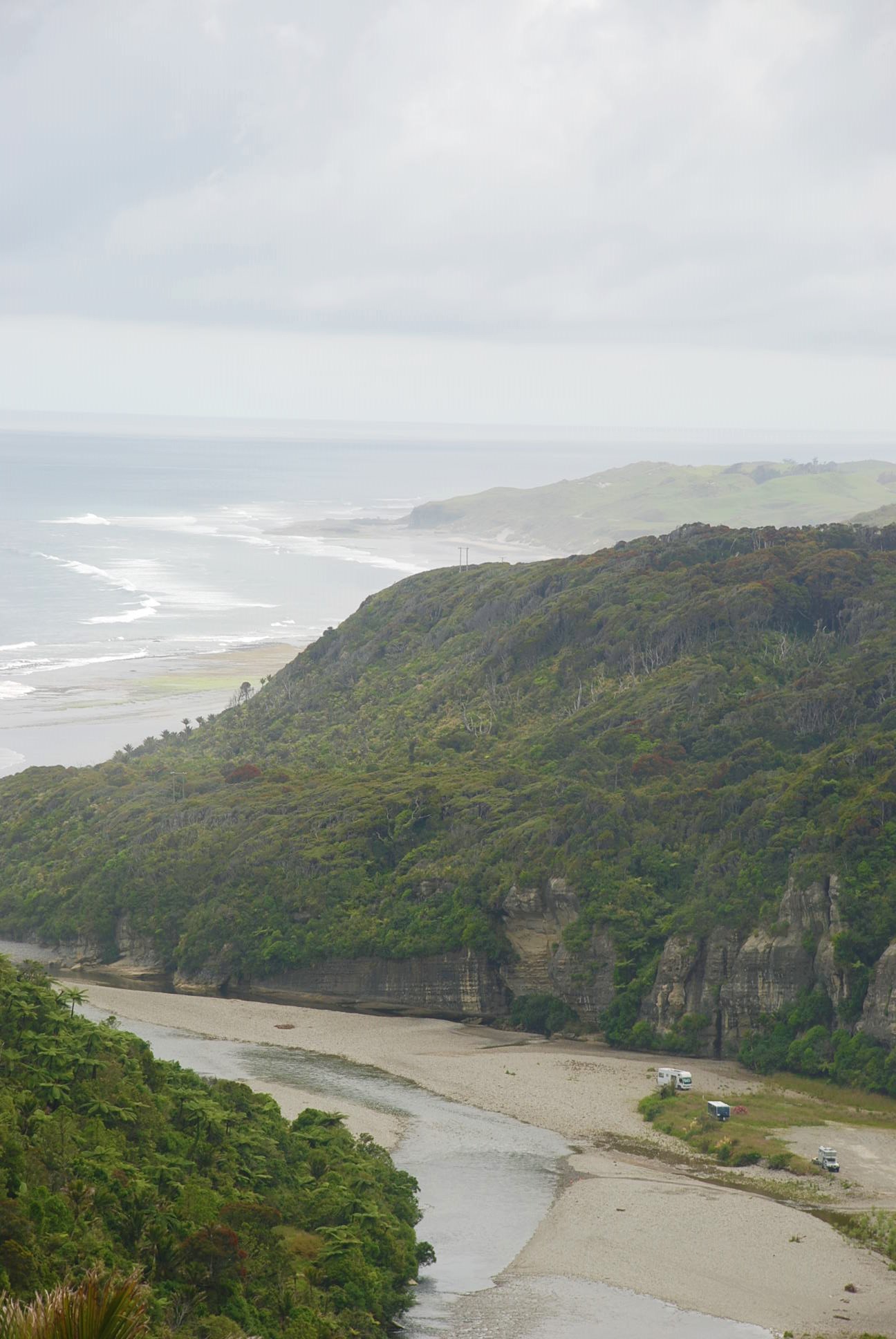 You can see a small white dot in the middle of the grass by the river – that’s our caravan – this is at Anatori, the end of the road from the North of the west coast of the South Island.