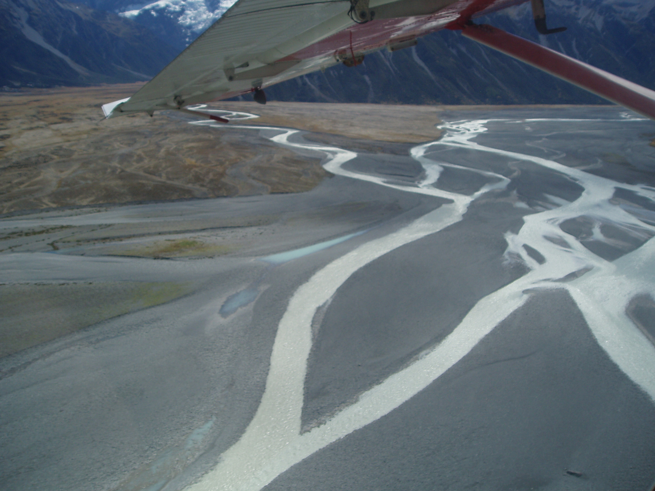 The waters from both these glaciers pool at the end of the glacier in Lake Tasman, before flowing south to in the wide valley of the Tasman River, whose braided streams flow south into Lake Pukaki. They eventually flow into the Waitaki River and to the Pacific Ocean north of Oamaru.