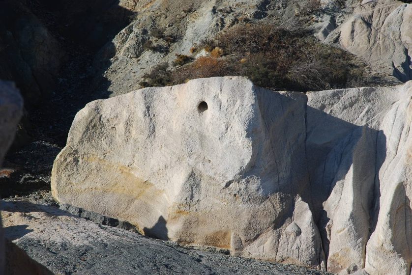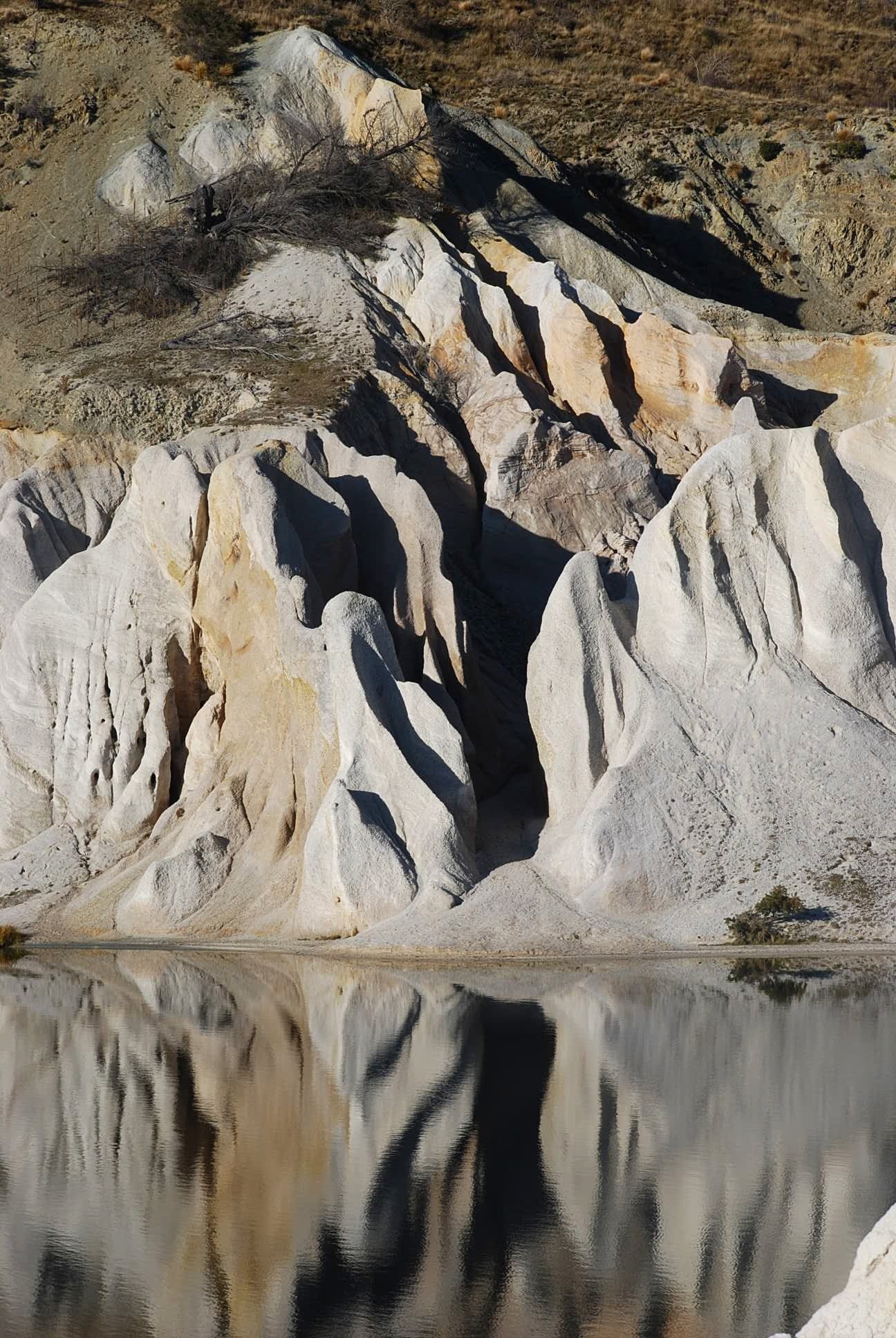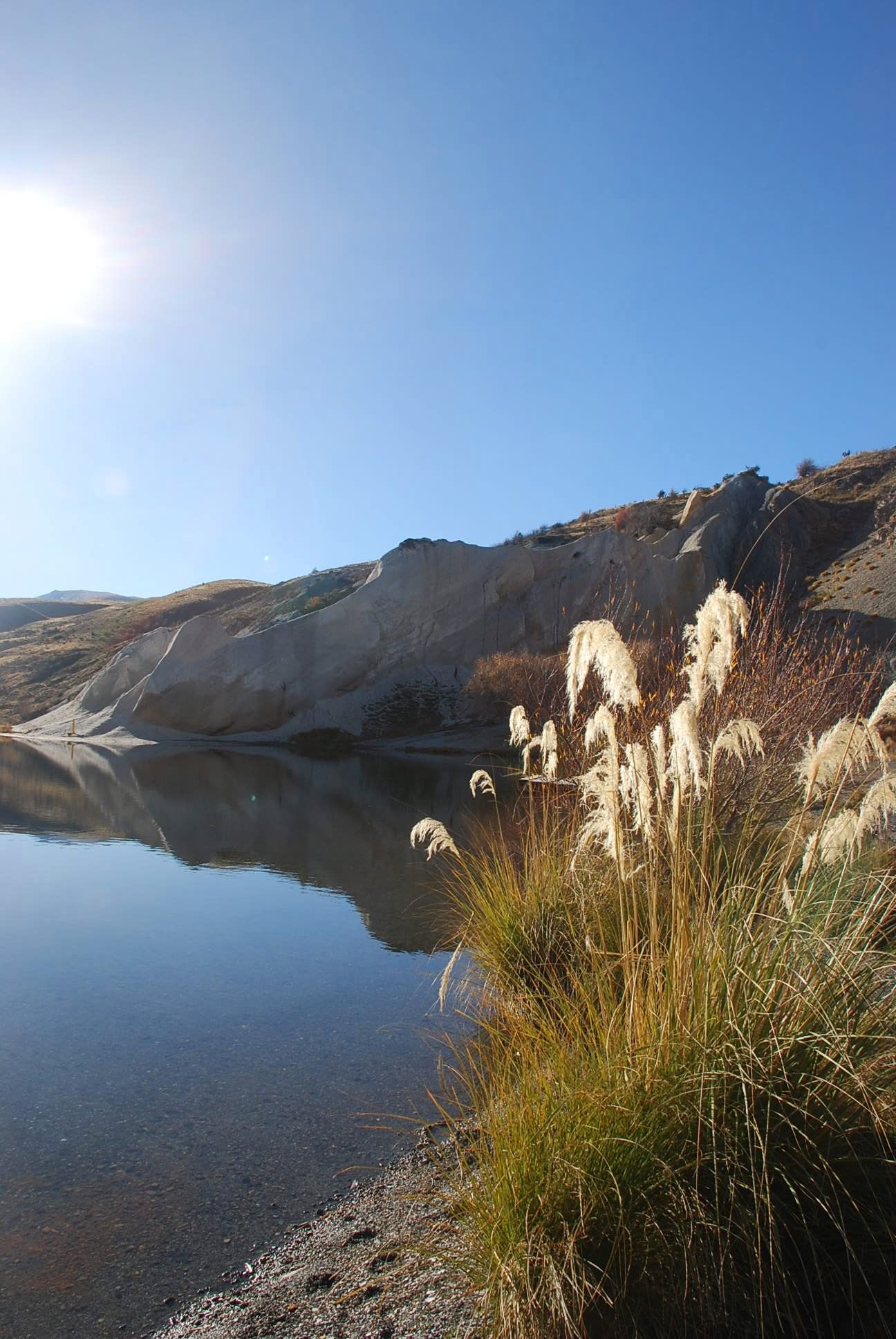 Mining was halted in 1934 because the sides of the pit were getting too close to the town. The huge hole was allowed to fill with water to create today’s beautiful lake surrounded by columns of white quartz tailings.