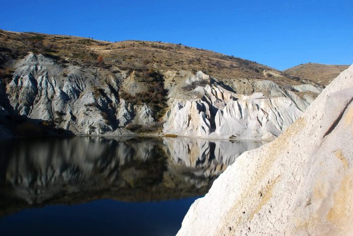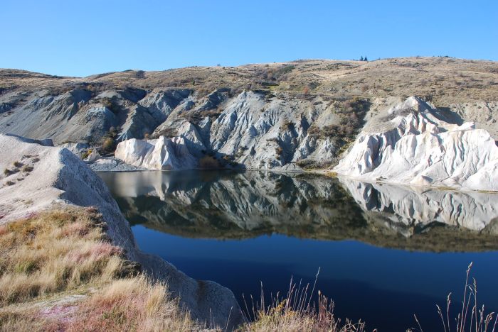 Close to the town, the Blue Lake was created by extensive mining activity. Beginning in 1864, miners chipped and sluiced their way through the quartz rock of the 120 metre high Kildare Hill. By 1933 the hill had become a 168 metre deep pit. From the 1880s the miners used hydraulic lift technology, like a giant vacuum cleaner, to suck water and gravel out of the pit to where it could be worked for gold.