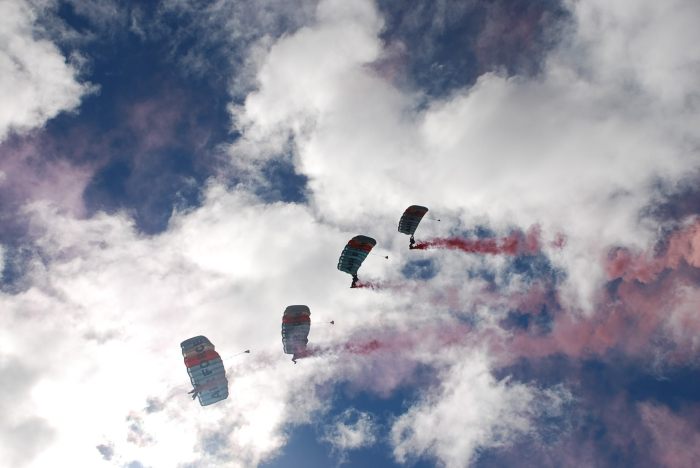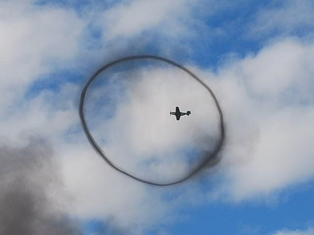Smoke form a mock battle in a perfect place to frame the plane flying overhead.