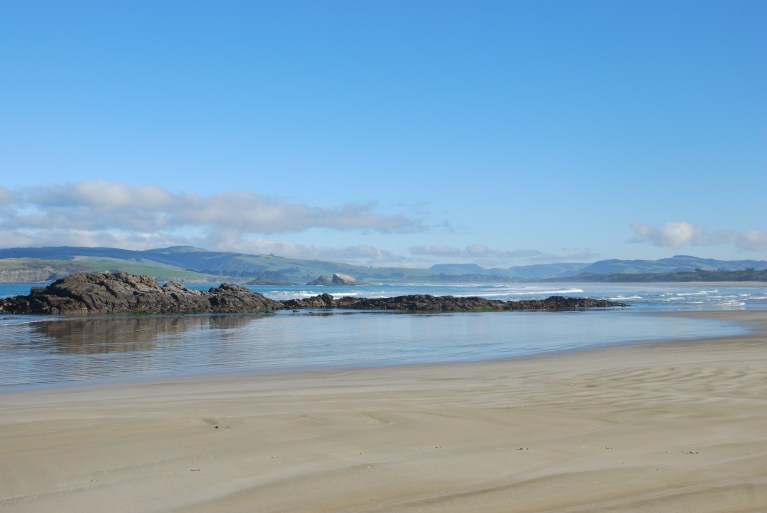 From Owaka, turn off Pounawea Road onto Newhaven road and turn right for the car park and beach.ing towards False Island on a cold winter’s day – still beautiful