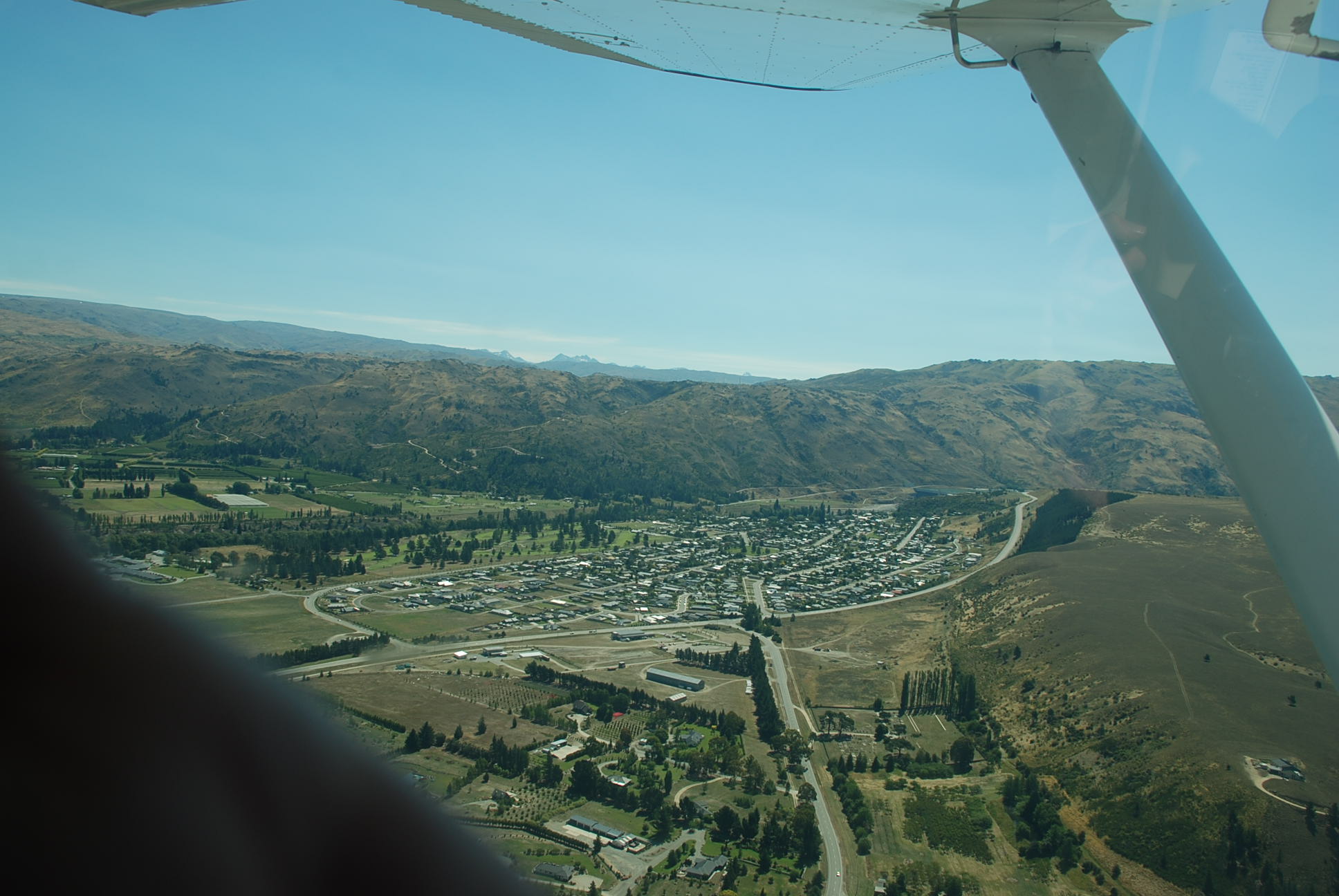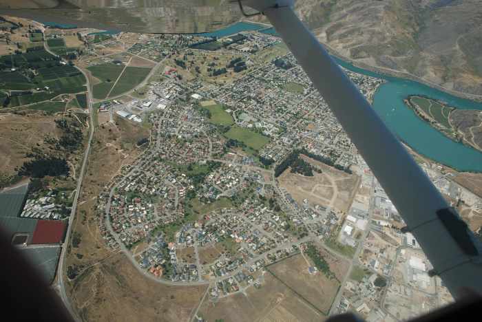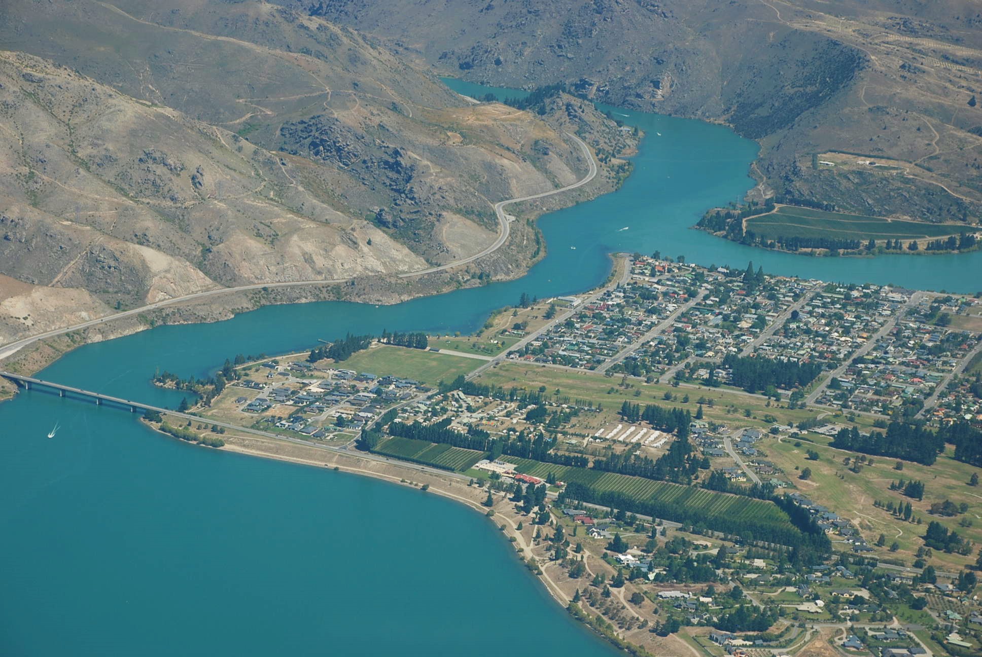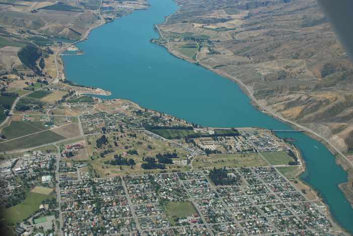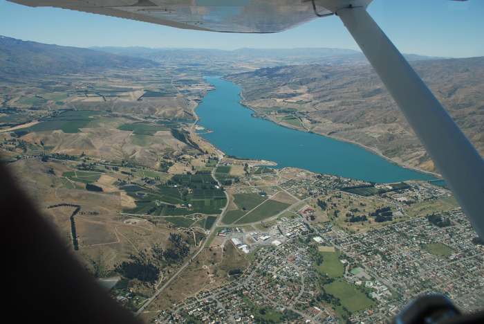 Cromwell and beautiful Lake Dunstan formed when the Dam and Power Station at Clyde was built. Wanaka is over the range on the top left of the photo.
