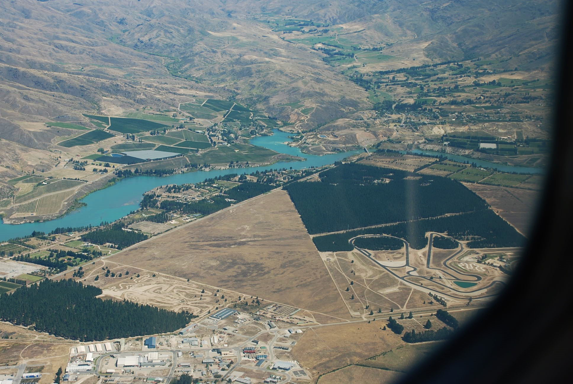 Looking over the Highlands motor sport, innovation and technology park where you can experience go karts, Lamborghini, V8 super cars, museum and much more. A close up view of the race track below. Historic Bannockburn and the Kawarau river are in the background.
