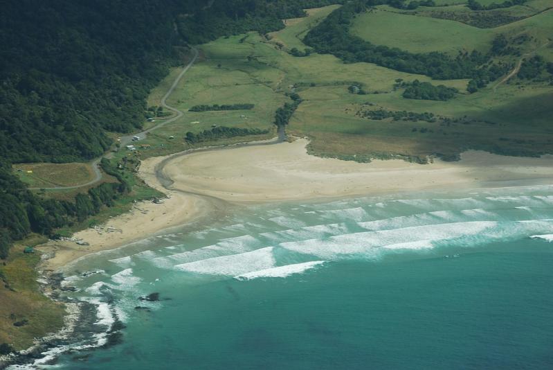 Tautuku Beach, Tautuku River mouth and peninsular where there are a few cribs seen above which, only accessible at low tide.
