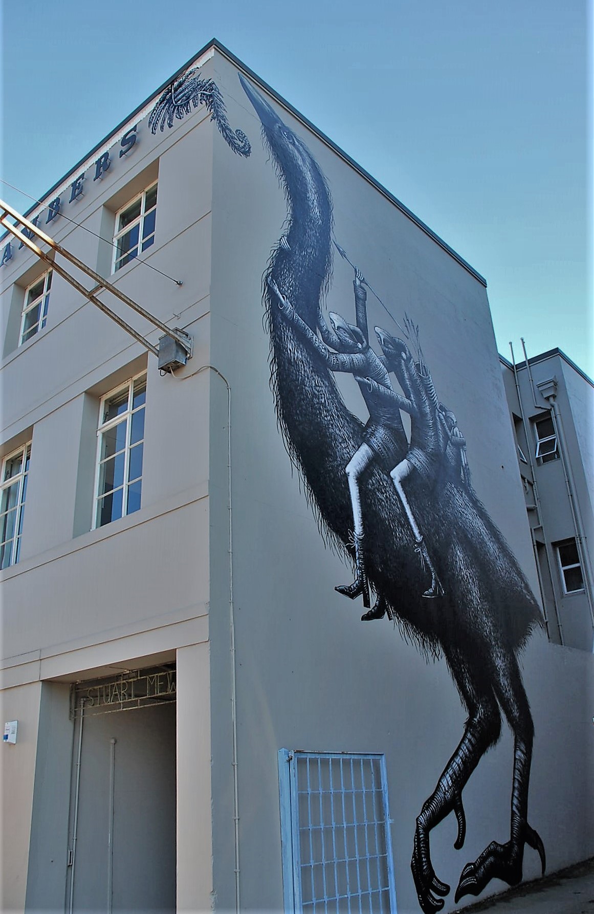 Moray Place – Here Phlegm paints his characters riding NZ’s extinct Moa bird.