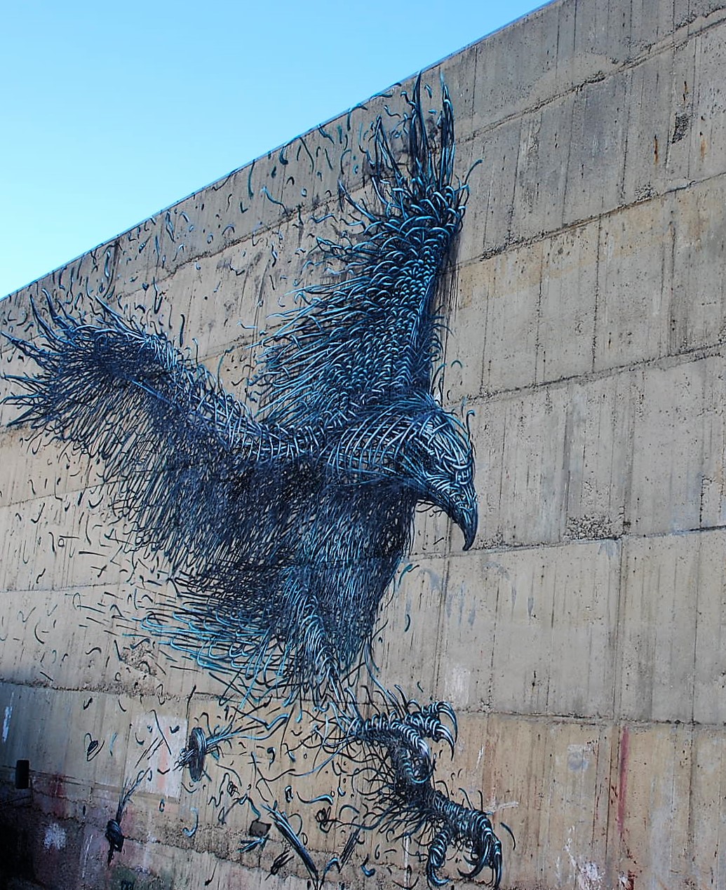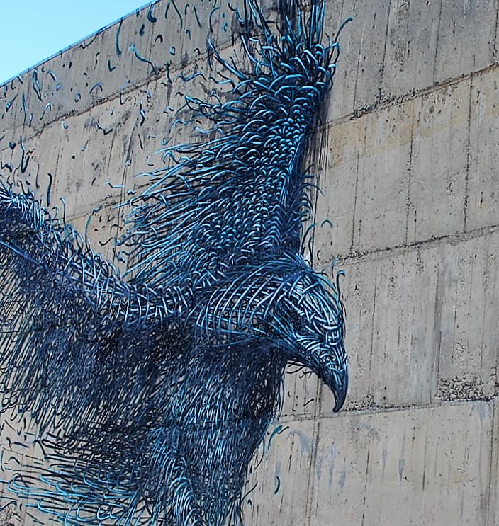Stafford Street – Chinese artist DALeast represents New Zealand’s extinct Haast Eagle and is reflective of his unique style which presents the frenetic shape of animals and people as if they have been constructed out of shards of metal.