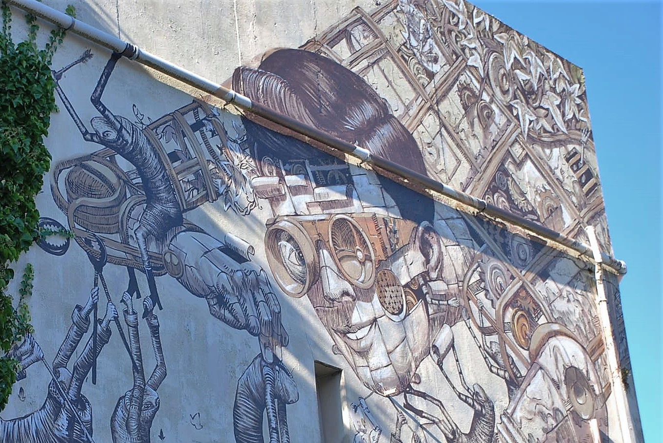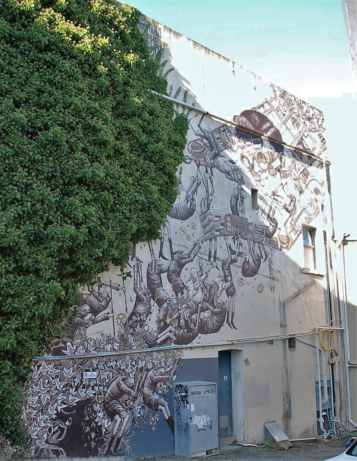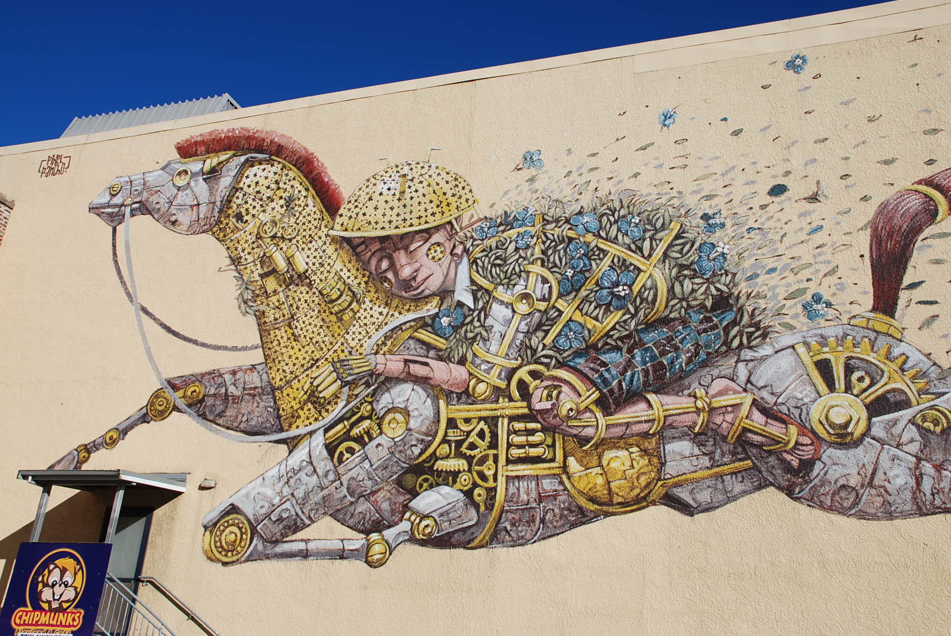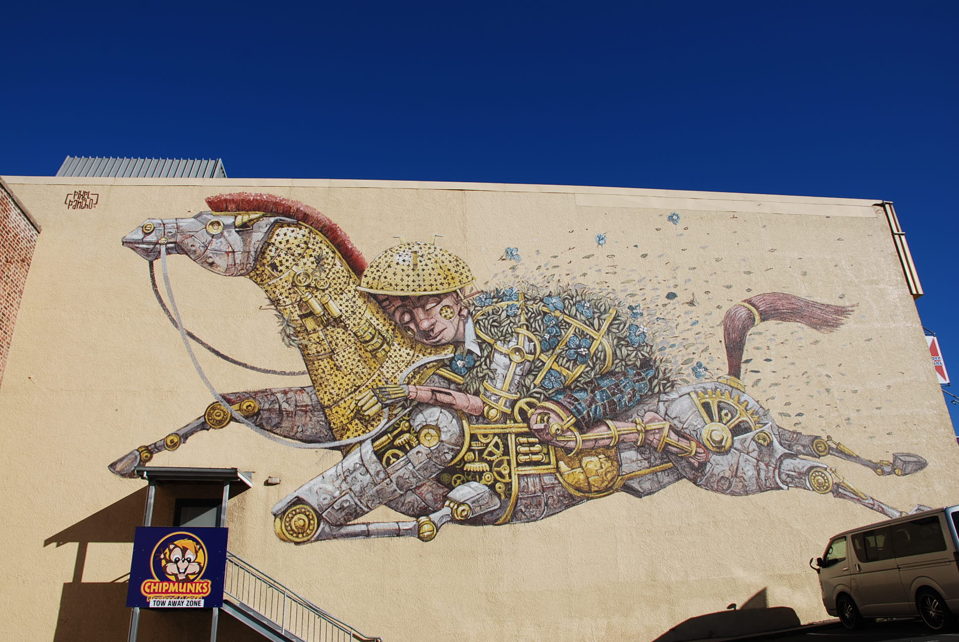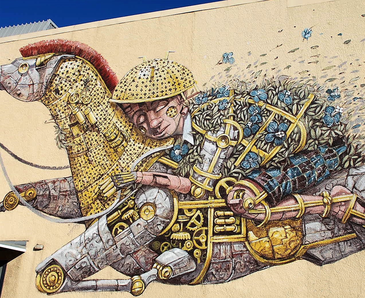 Corner of Jetty Street and Princes Street -“Riding Dreams” by Pixel Pancho demonstrates a complex interweaving of the human form, flora, and metal to create the surreal image of a ‘not quite human’ boy riding a fantastical metal horse reflecting his fascination with 1950s robots.