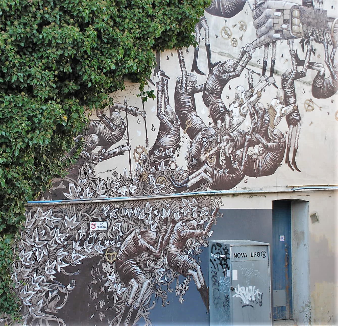 Stafford Street – This piece is a world first collaboration by Pixel Pancho and Phlegm and presents the successful mixing of their own unique style creating a surreal battle between Pixel Pancho’s robots and Phlegm’s sloth-like creatures