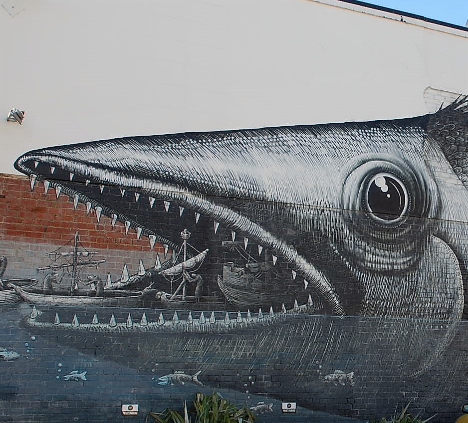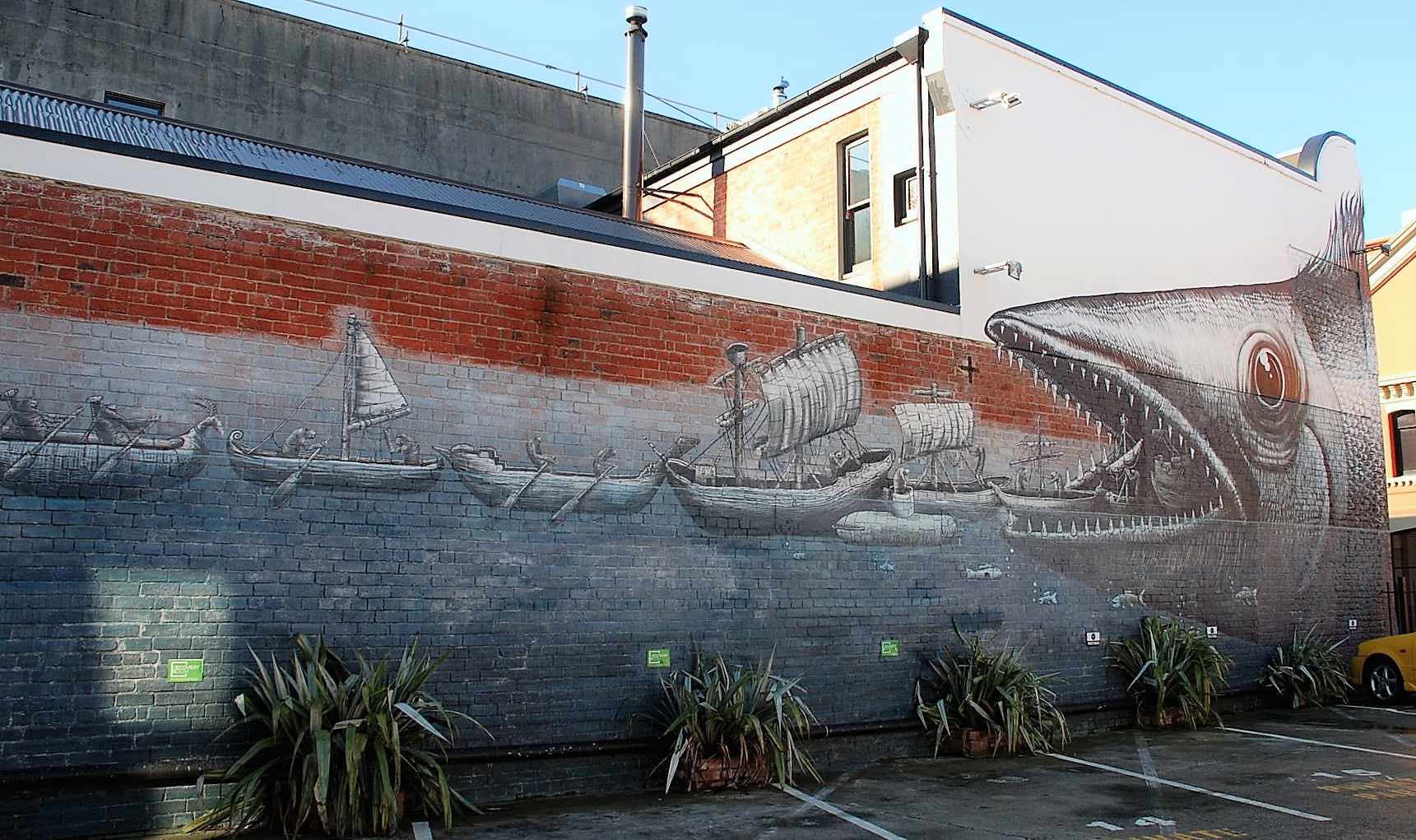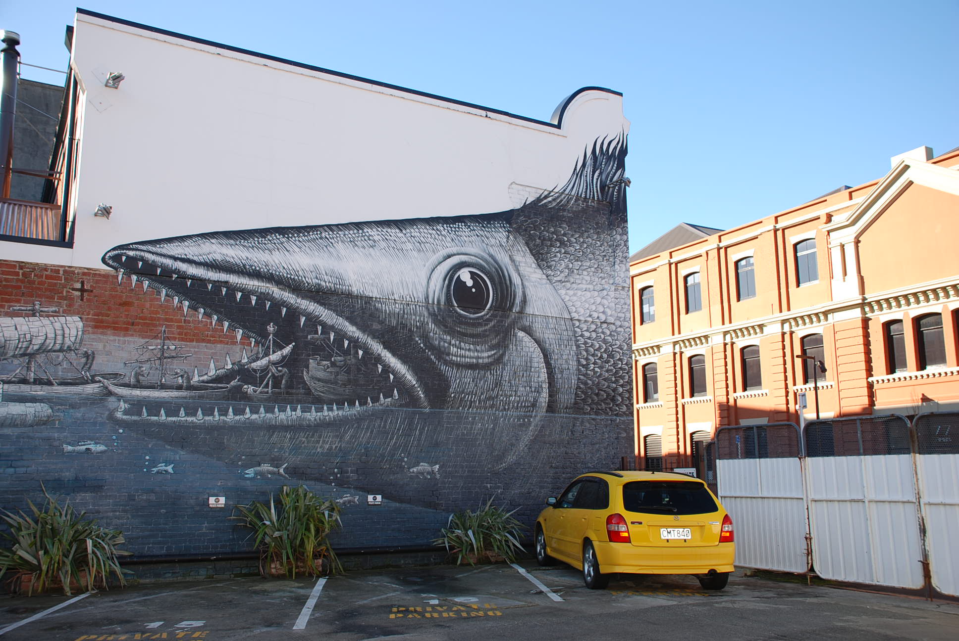 Vogel Street – Māori waka and a steam-punk like submarine (a reference to the incident where a Japanese submarine was supported in the Otago Harbour) emerge from a fish’s mouth in this distinctive piece by Phlegm which incorporates local history alongside his distinctly fantastical style.