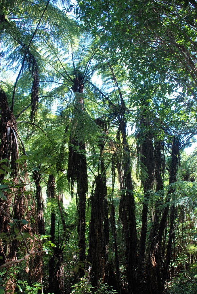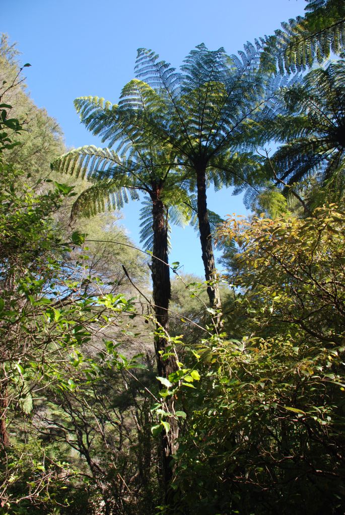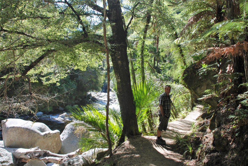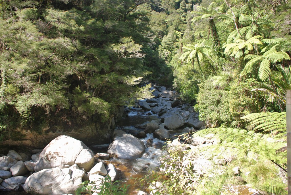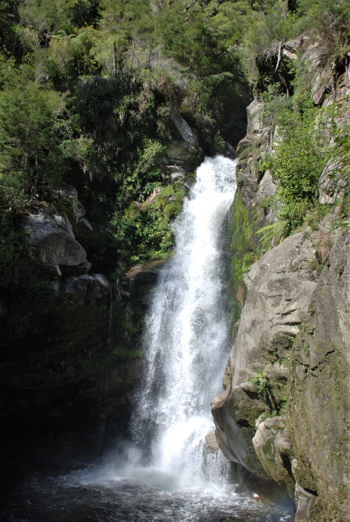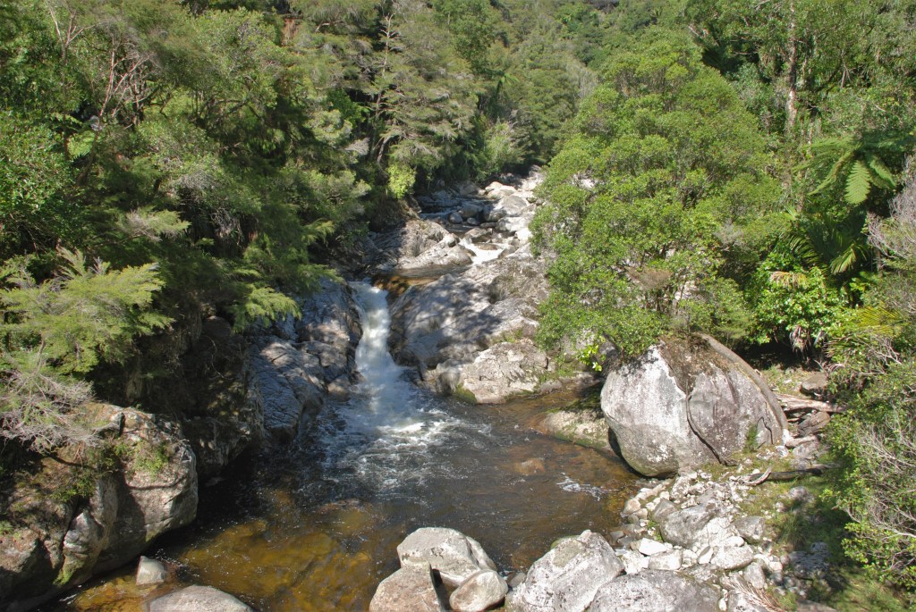 The track ends at a area that provides a great view of the waterfall. The 20 metre Wainui waterfall cascades over granite bedrock into a deep pool at it’s base.