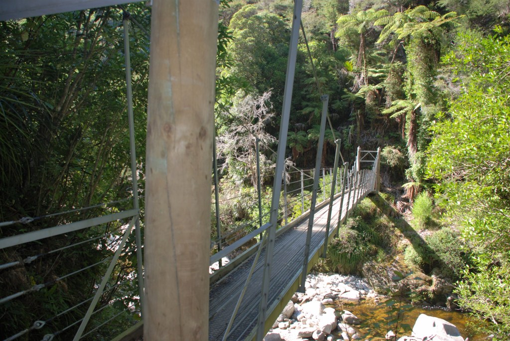 This is an easy walking track with a great suspension bridge and beautiful bush, palms and ferns. The 3.4 km track takes approx. 1hr. Return to the Wainui Bay car park on the same track.