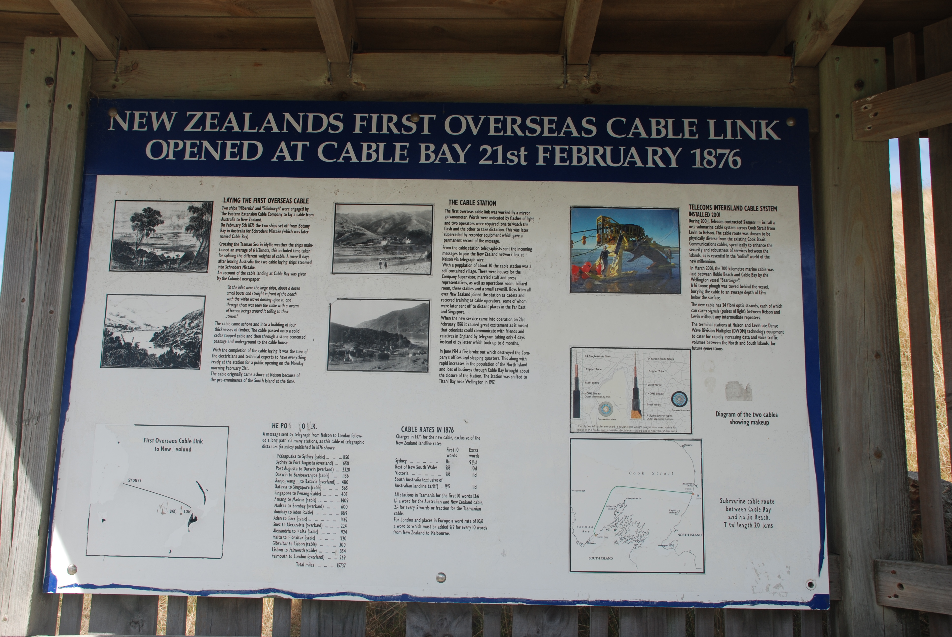 The laying of New Zealand’s first international telegraph cable was from Sydney to Cable Bay, it took 11 days and transmission began in 1876. The cable came ashore into a timber building and from the cable station, messages were sent to Nelson via telegraph wire. This new service meant communications to Europe only took four days instead of up to six months for letters. With a population of about 30, the cable station was a self-contained village. The office and sleeping quarters burned down in 1914, the station remained in operation until 1917 when the cable was shifted to Titahi Bay near Wellington.