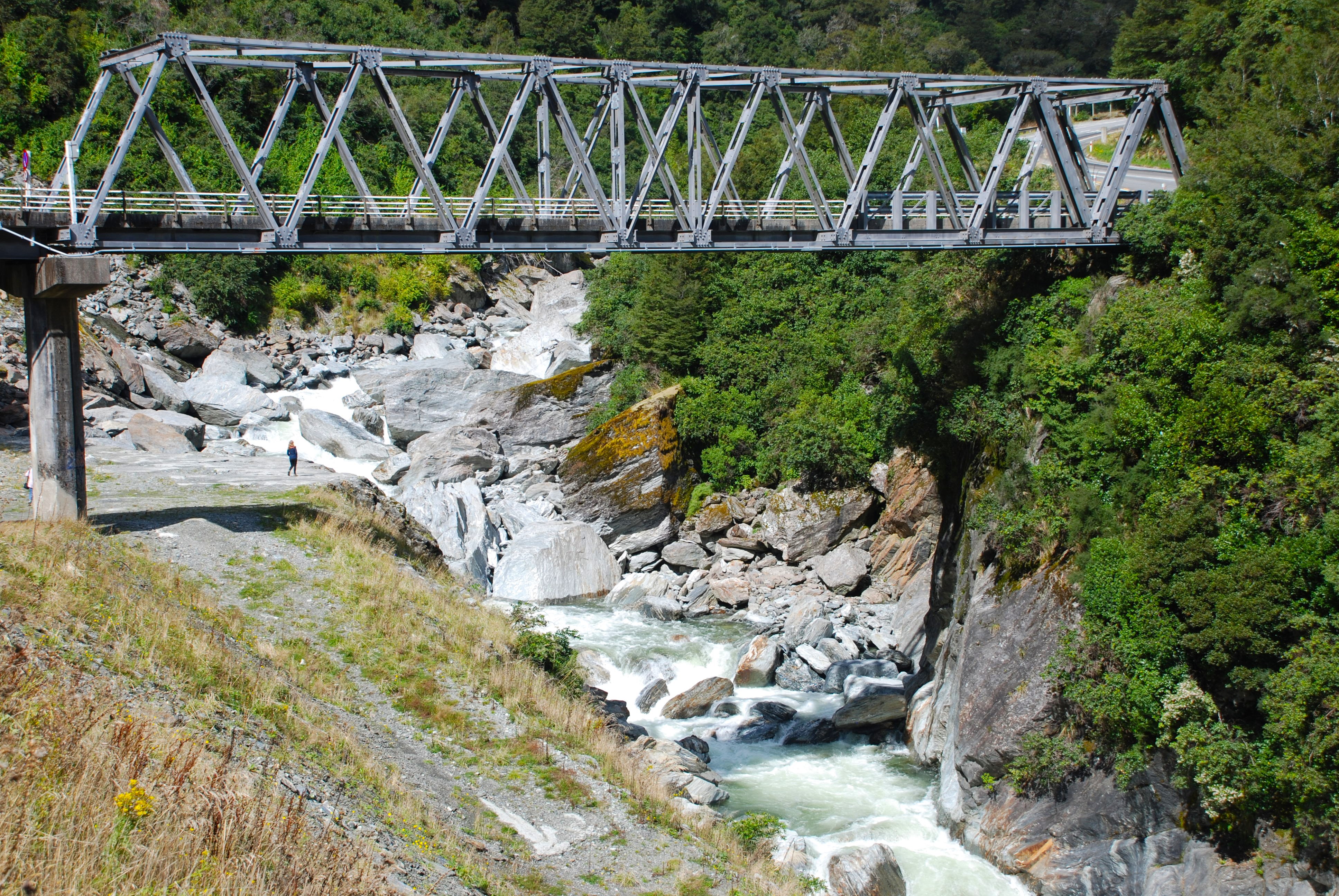 From the blue pools, 18.7km towards Haast you will come to the Gates of Haast. The bridge spans a gorge on the Haast River in Mount Aspiring National Park in the South Island of New Zealand. The Gates of Haast has sheer rock cliffs above a steep cascade in the Haast River. It is 56 km from here to the township of Haast.