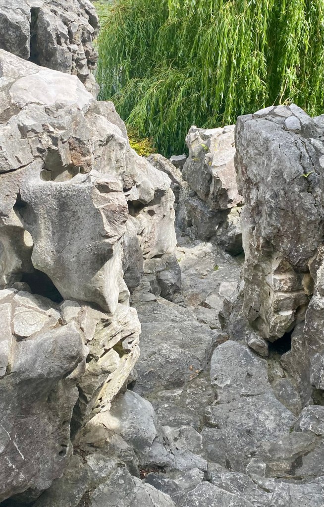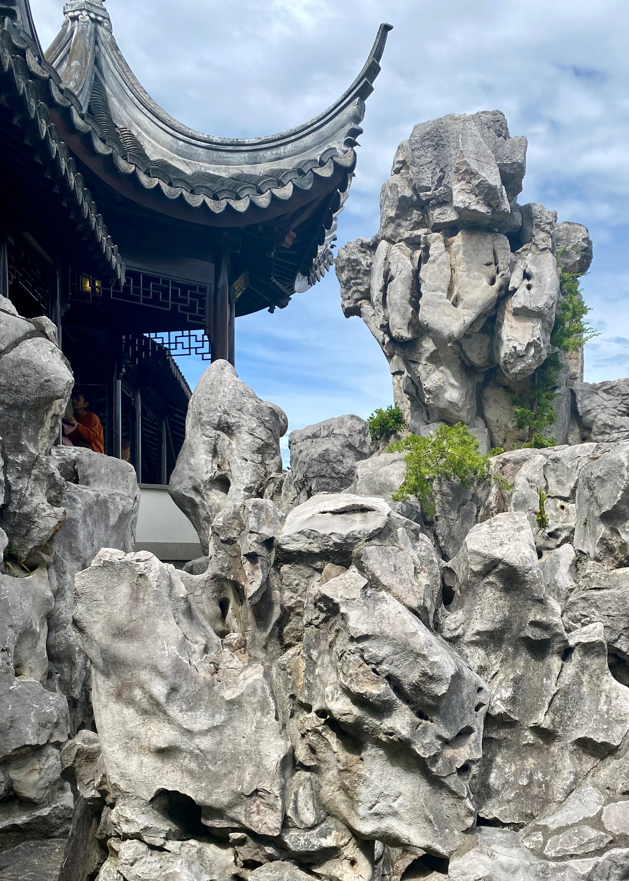 The rock mountain pathways are amazing. When you reach the mountain summit, there is a half pavilion which symbolizes the Ming philosophy of “keeping the clouds and borrowing the moon.”