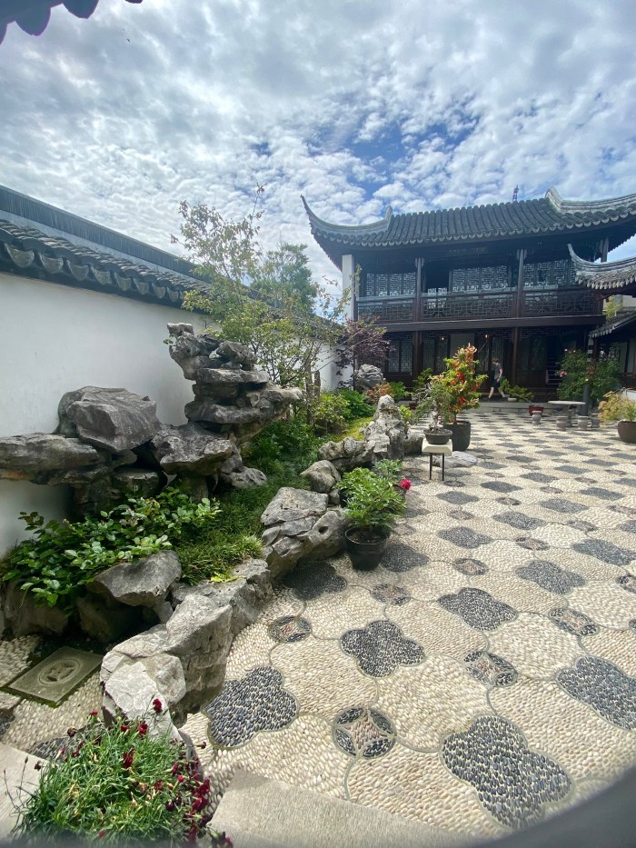 The sheltered courtyard serves as a communal space to enjoy traditional Chinese refreshments.