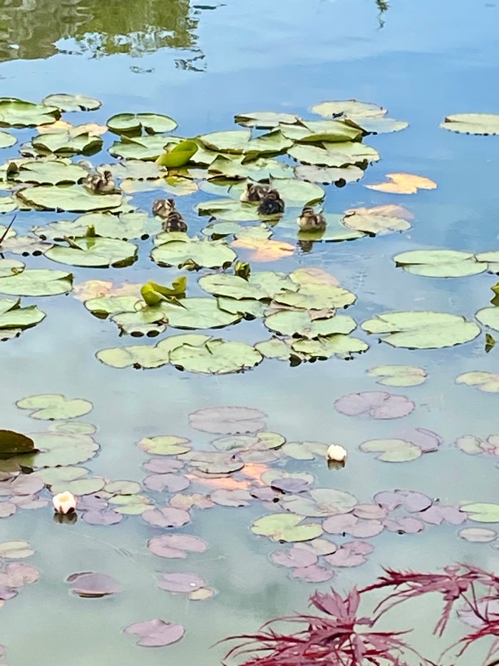 Ducklings sitting on lily pads on the lake.